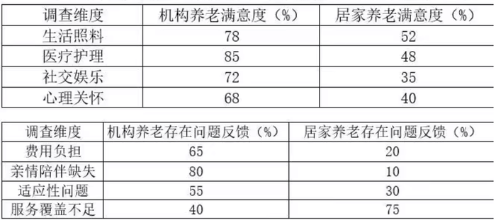 当前,我国正加速迈入深度老龄化社会。第七次全国人口普查数据显示,60岁及以上人口占总人口比例已达18.70%,预计到2035年,这一比例将突破30%,养老问题成为全社会关注的焦点。为应对这一挑战,我国逐步形成了以居家为基础、社区为依托、机构为补充的多层次养老服务体系,其中机构养老和居家养老作为两种主要模式,各有特点。以下是关于机构养老和居家养老的相关调查数据表格。请结合上述背景与调查数据,分析机构养老和居家养老的优缺点,并阐述完善养老服务的思路?